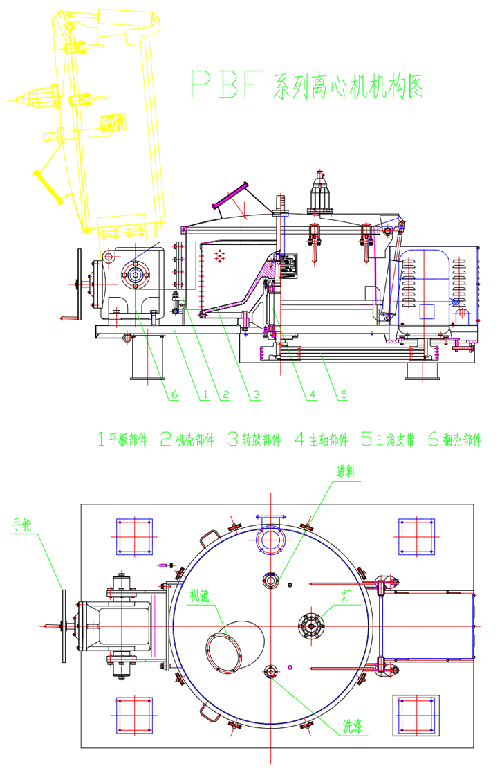 3.全翻壳设计:可对离心机外壳与转鼓夹层空间进行彻底清洗,有效清除批次间的交叉污染。上盖设置,进料、水洗、视镜、防爆灯、充氮口。