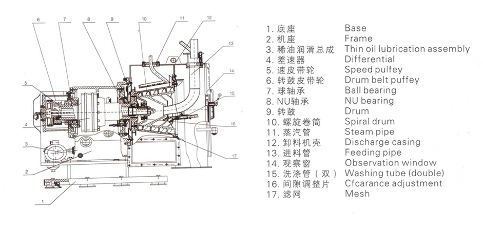 网上残留固体被螺旋叶片约在1秒内排放。因此,网上的固体变薄,降低过滤阻力,确保良好的脱水性能。
